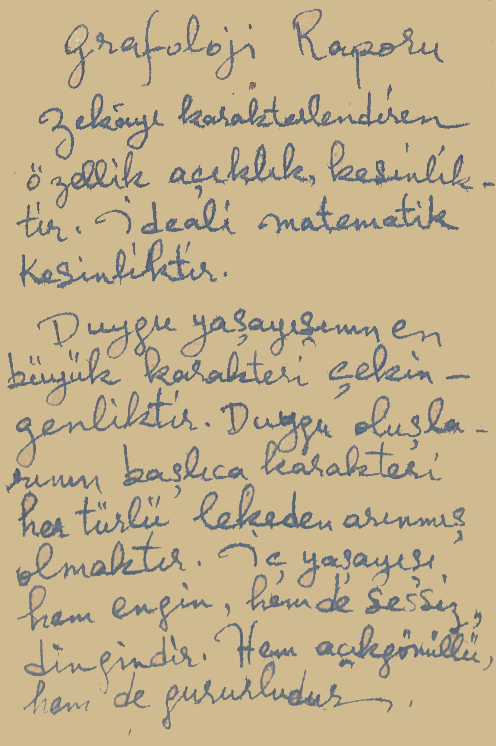 In a letter dated 25 January 1953, in which he analyzes the handwriting of Haldun Özen, Baltacıoğlu states the following: