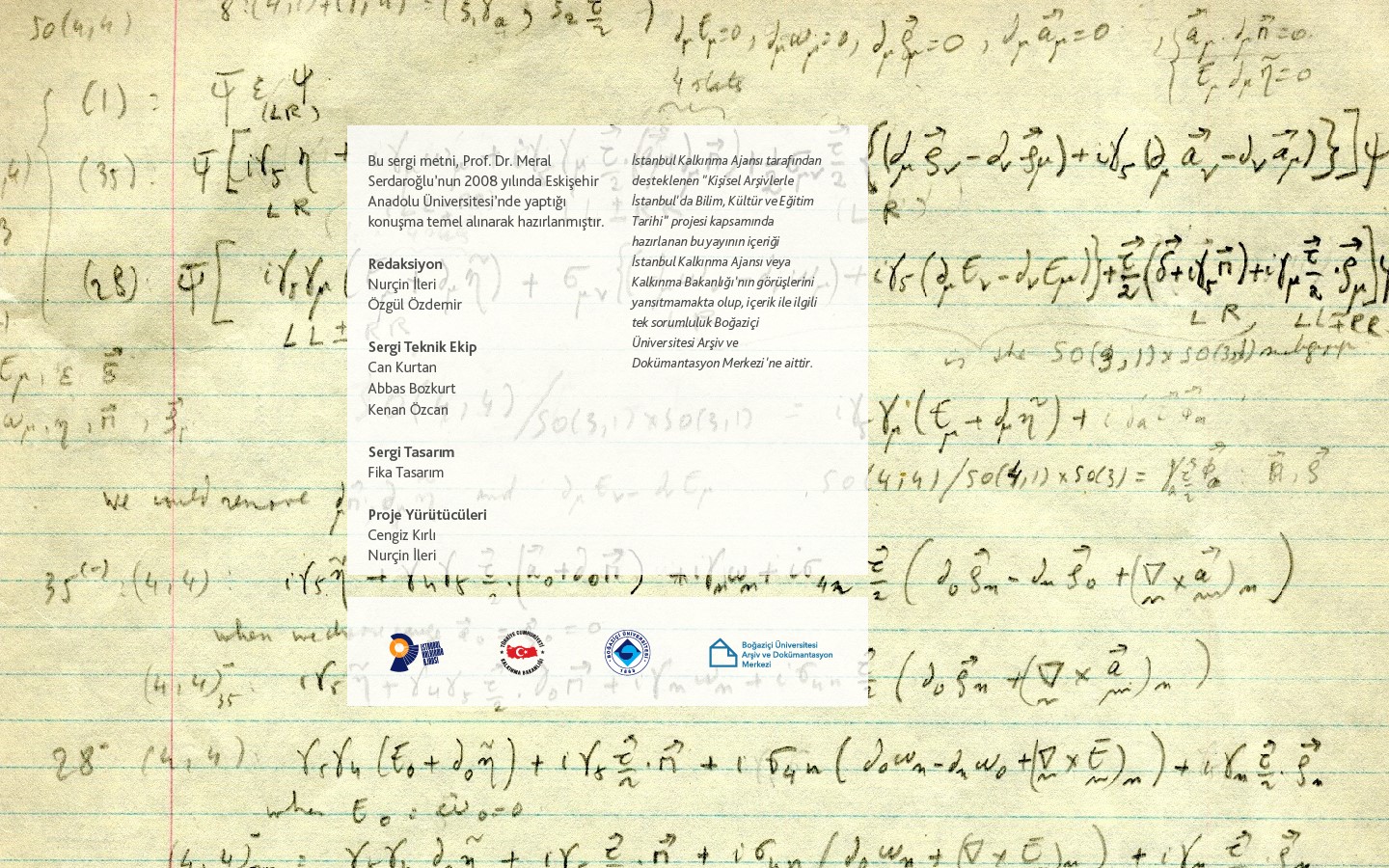 Feza Gürsey Arşivi, 1992 yılında Feza Gürsey’in ve sonrasında annesi Remziye Hisar’ın vefatlarının ardından, Anadolu Hisarı’ndaki evi boşaltılırken Prof. Dr. Meral Serdaroğlu’nun evdeki yazılı malzemeyi toparlayarak muhafaza etmesi ile oluştu. Yıllar içinde yakın çevresi, ailesi ve meslektaşlarından gelenler ve Feza Gürsey adına yapılan anma etkinliklerinde ortaya çıkan konuşmalar ve yazılarla arşiv zenginleşti. Arşivin içeriğini tanıtan bir sergi, Meral Serdaroğlu’nun girişimi ile birlikte, Cihan Saçlıoğlu, Fethiye Erbay, Mutlu Erbay, Mahir Polat, Murat Es, Binnur Polat, Aslı Aydemir, Filiz Çermen, Cem Onur Erbay, Mehmet Sinan Niyazioğlu’nun katkılarıyla 1992 yılında gerçekleşti. Bu isimlerin yanı sıra Feza Gürsey Arşivi’nin oluşması ve araştırmaya uygun hale gelmesi için içtenlikle ve maddi hiçbir karşılığı olmaksızın çaba sarf eden isimlerden birisi de 2007 yılında gerçekleşen uçak kazasında yitirdiğimiz, Fizik Bölümü yüksek lisans öğrencilerinden Engin Abat’tı. Başta Meral Serdaroğlu ve Engin Abat olmak üzere Feza Gürsey sevgisi ortak paydaları olan, yukarıda ismi geçen değerli insanların/akademisyenlerin emeğiyle bu online serginin mümkün olduğunu hatırlatarak, bu sürece dahil olabilmemin mutluluğunu paylaşmak isteriz.